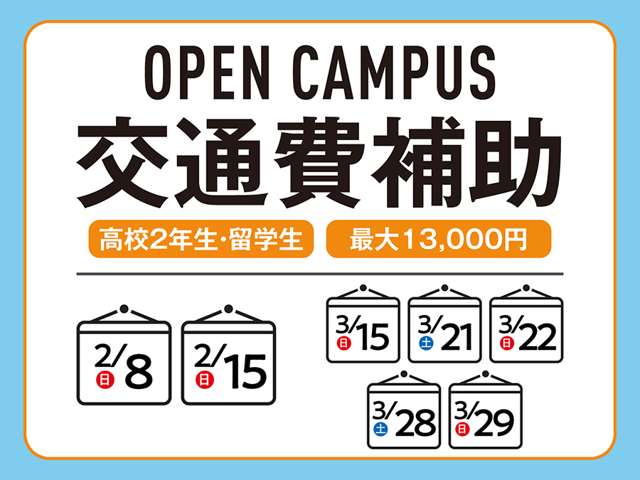 本校のオープンキャンパスに参加される高校2年生・留学生(2027年4月入学者)を対象に、交通費をサポート! この機会にぜひご参加ください! ※ご利用には条件がございます。下記内容をよく...