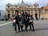 アニカレダイアリー ローマから帰国!! 2010/12/08 今回は、ローマから少し離れた、ラピュタのモデルにもなっている「チヴィタ」にも足を運んだようです。 また、トレビの泉やコロッセオ、サン・ピエトロ大聖堂・・・と盛りだくさんの観光を経て 先ほどイタリア・ローマからパリ経由で、たくさんの想い出とお土産と一緒に無事帰国した学生たち。(大雪のため、パリで少し足止めされたようですが・・・) この経験を大切にこれからもいろんなことにチャレンジしていって欲しいですね。