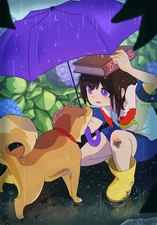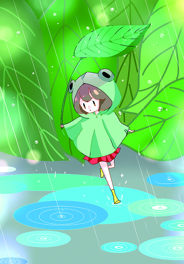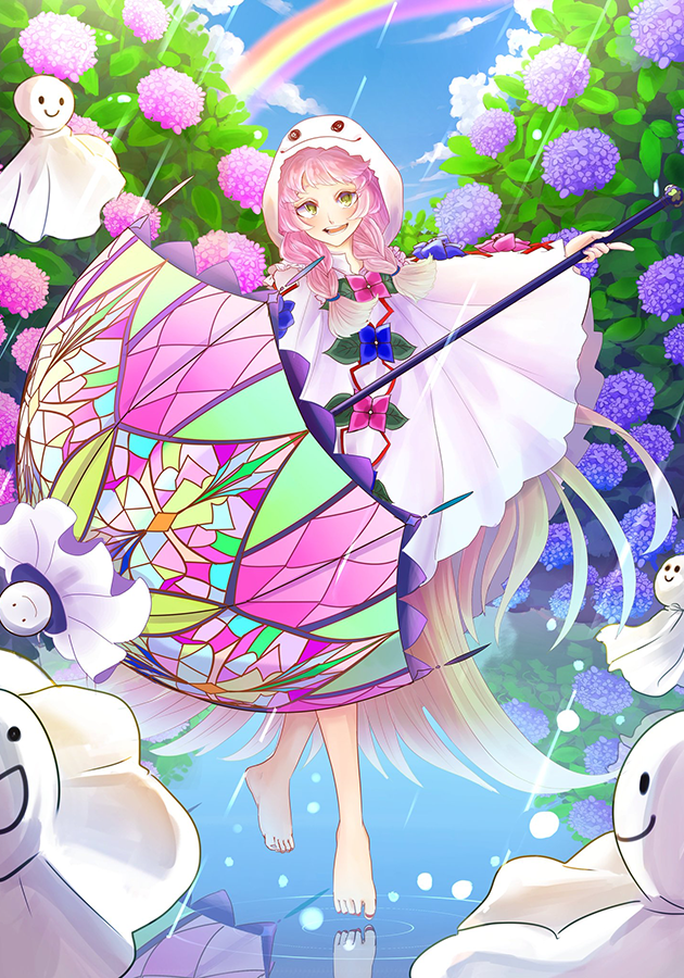 妖精でしょうか?傘代わりの葉っぱを手に水たまりで戯れている姿がかわいらしいです。