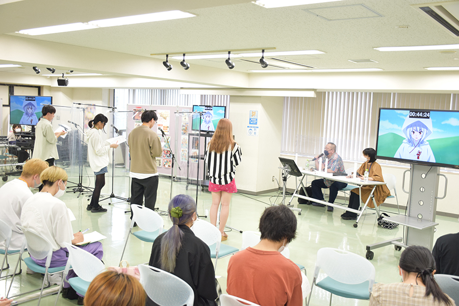 『どんな人がオーディションで選ばれるのかの実践』と題しまして、学生各自が事前に収録したボイスサンプルを三間様にお聞きいただき、当日はその中からキャスティングされた学生たちがアフレコ実践でご指導いただきました。