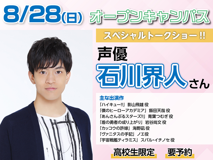 オープンキャンパスのゲストとして、「ハイキュー!!」影山飛雄役、「僕のヒーローアカデミア」飯田天哉役など、多数ご出演の声優 石川界人さんが来校!!