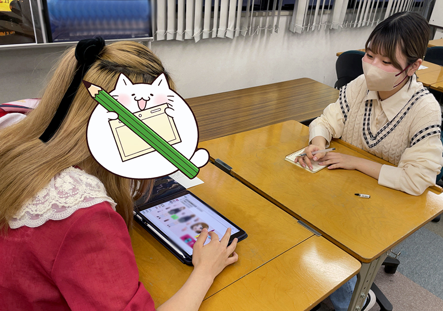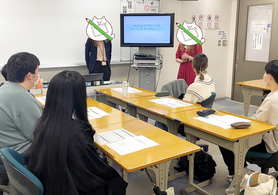 そんな現場の第一線で活躍される先輩から直接ポートフォリオのアドバイスをいただけるとのことで、教室に集まった学生たちもちょっと緊張気味。しかし、ポートフォリオを見ていただくうちに、学生たちから聞きたいことが止まらず、有意義な時間となりました。ポートフォリオのことだけにとどまらず、東京での生活や就職活動などについてもひとりひとりに丁寧にアドバイスをいただきました。