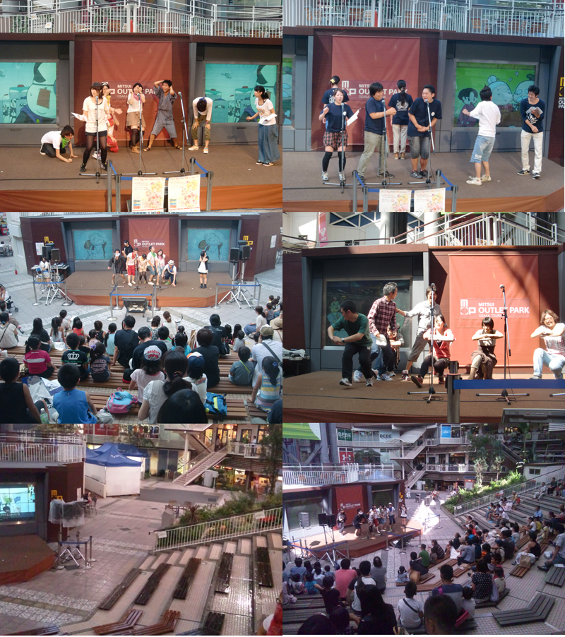 初日の8/27(土)、1ステージ目終了15:00過ぎ、「なんか降りそうね・・・。」と言って、みんなで空を見上げていると、大きな雨しずくがボタボタって・・・。三井アウトレット大阪鶴見は、屋外に抜けている部分が多く、最初は「少しぐらい大丈夫~」なんて呑気なことを言ってましたが、それは数分の間だけ・・・。「ゲリラ豪雨襲来!!」みんなで逃げ惑うことになりました。雷は凄い音で鳴るし雨は激しすぎ・・・。学生の様子も種々様々です。雷に泣き出す女の子、やたら盛り上がる祖先の血が濃い学生たち、あまりの激しさに空を見上げるもの、素直に機材のことを心配する優等生等、結果的には2ステージ目中止!残念な初日になってしまいました。かなり、いい感じで1ステージ目を終えて、これからっていう時だったのに・・・残念。帰ってから1時間に77mmの雨、大阪付近は観測史上最大雨量ということを知りました。続けていたら、浮き輪パンダとタマネギでたいへんなことになったかもしれません(笑)。なのに 2日目は、初日のメンバーが悔しがるほど、8月終わりを感じる気持ちいい風、そして、たくさんの方々に見て頂き、スムースに爽やかに運びました・・・良かったね。この両日の違いに考え込んでしまいます。野外のイベントは水ものやっっっっ!!
