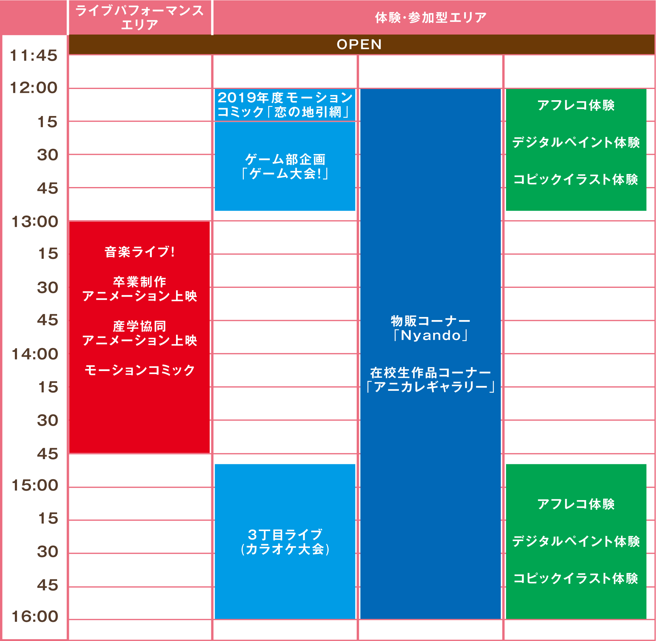 在校生によるライブパフォーマンスや「声優」「アニメ」「マンガ・イラスト」分野の様々な体験ができる体験コーナーもありますよ!!