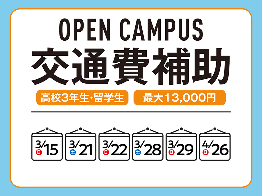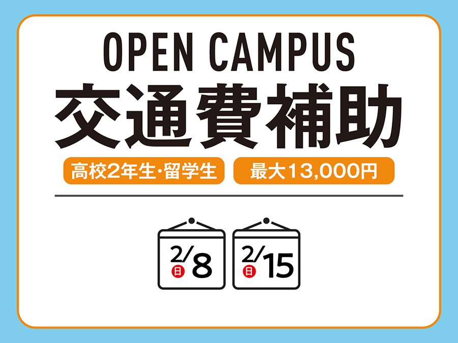 本校のオープンキャンパスに参加される高校2年生・留学生(2027年4月入学者)を対象に、交通費をサポート!