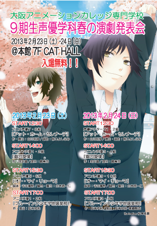 アニカレダイアリー 9期生 声優学科「春の演劇発表会」 2013/02/22 声優学科1年生の締めくくり「春の演劇発表会」を2日間で8公演行います。 この日に向けて練習を重ねてきた成果をご覧ください! みなさん是非お越しください♪ 【日時】 2月23日(土)24日(日) 開場12:00/開演12:30 【場所】 大阪アニメーションカレッジ専門学校 本館7F CATHALL