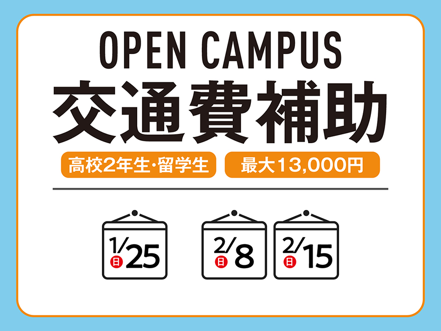 本校のオープンキャンパスに参加される高校2年生・留学生(2027年4月入学者)を対象に、交通費をサポート! この機会にぜひご参加ください! ※ご……