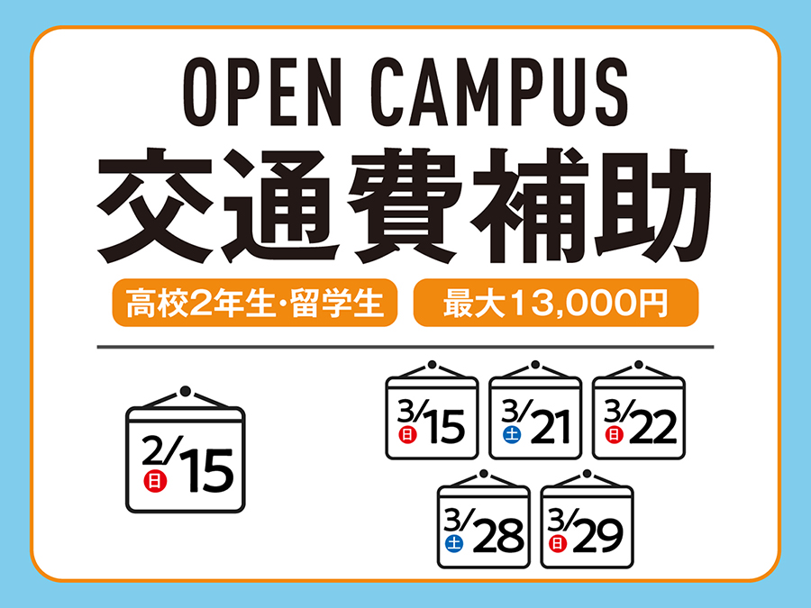 本校のオープンキャンパスに参加される高校2年生・留学生(2027年4月入学者)を対象に、交通費をサポート! この機会にぜひご参加ください! ※ご……